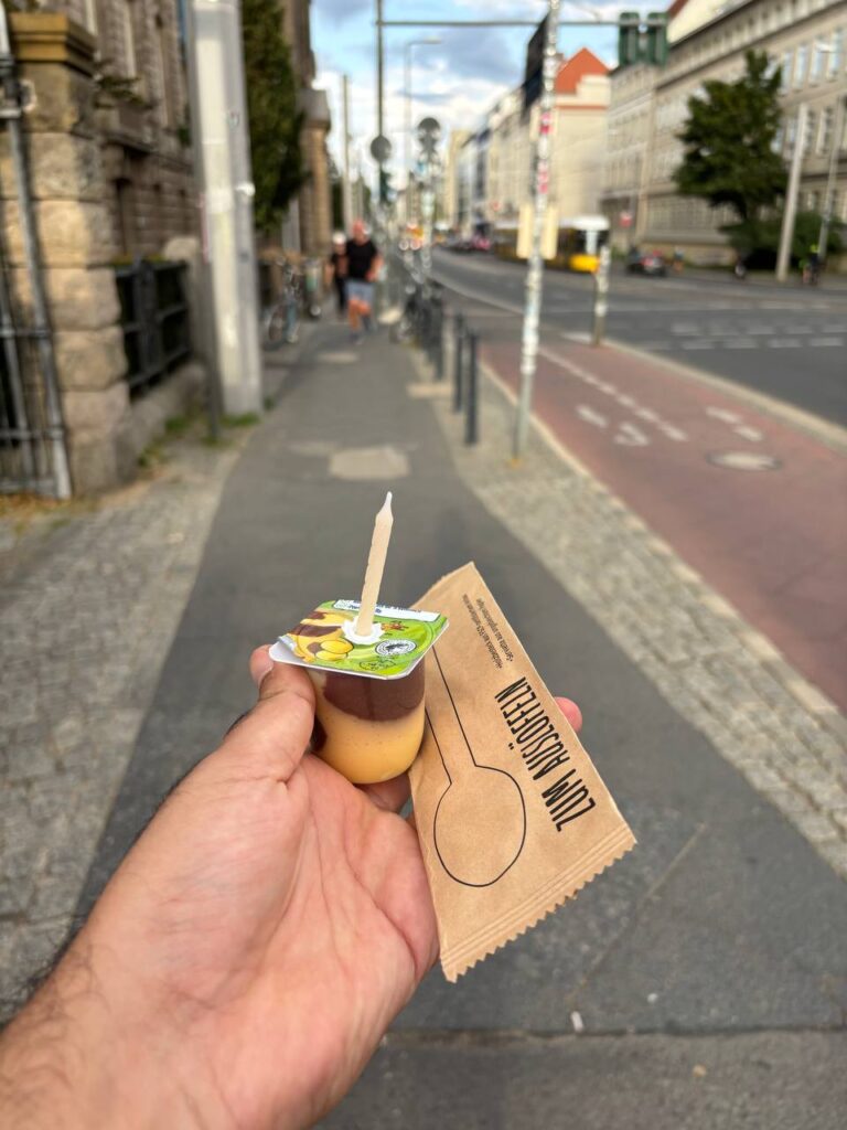 چاقسلامتی کردیم. ازم پرسید برای هفتهی هنر برلین آمده بودی اینجا؟ گفتم آره و بعد برگشت بهم گفت امروز تولدمه. بهش گفتم تولدت مبارک از کیسهای که دستش بود یک کارامل یک نفره درآورد، یک شمع خیلی کوچک هم رویش گذاشت و با یک قاشق چوبی بهم داد. خیلی باحال بود. دوباره بهش تبریک تولد گفتم و خداحافظی کردیم. گویا این فرهنگشان است که اگر روز تولدشان است، خودشان میروند شیرینی میخرند و به بقیه تعارف میکنند و مهمانشان میکنند و همگان را از شرینی وجودشان بهرهمند.